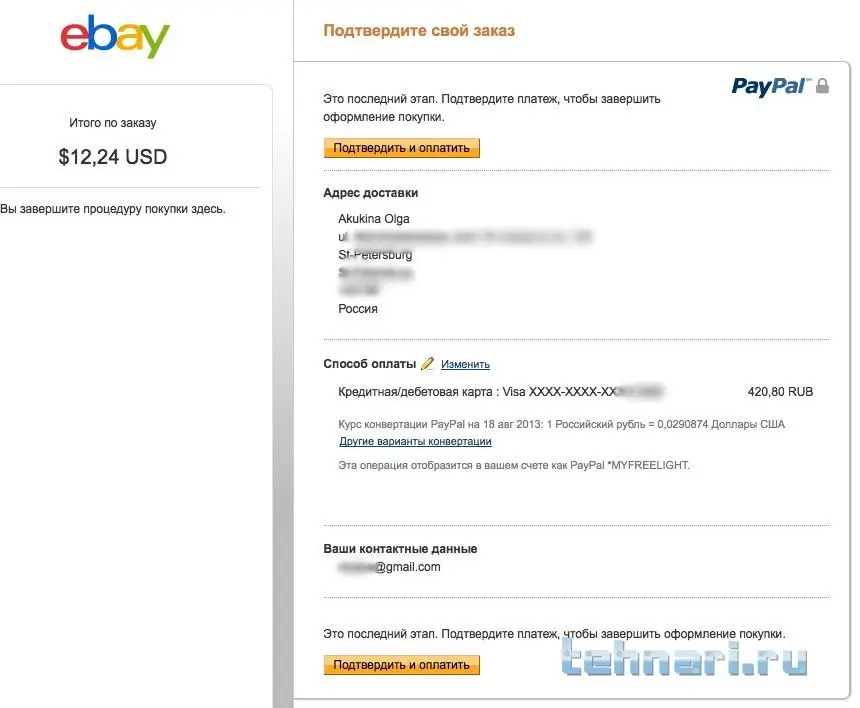Далее вас перебросят на страницу авторизации в PayPal, вводите логин и пароль. Затем можно еще раз подтвердить адрес доставки, выбрать карту, с которой платить, если у вас их несколько.