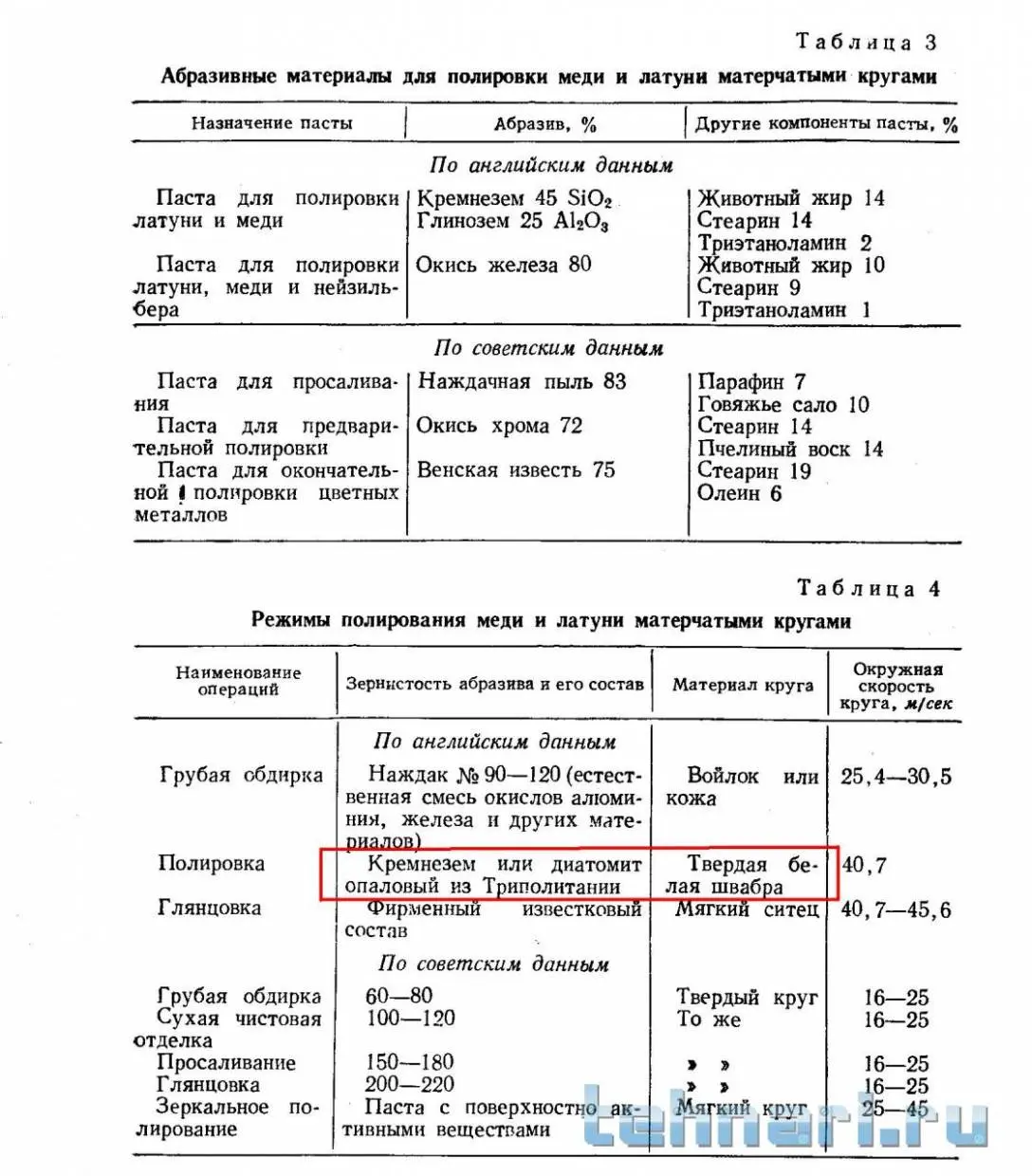 Наткнулся на просторах интернета на интересную выдержку из старой книги по шлифовке и полировке изделий из металлов. Приведены некоторые режимы операций, а также упомянуты интересные материалы и инструменты для полировки.