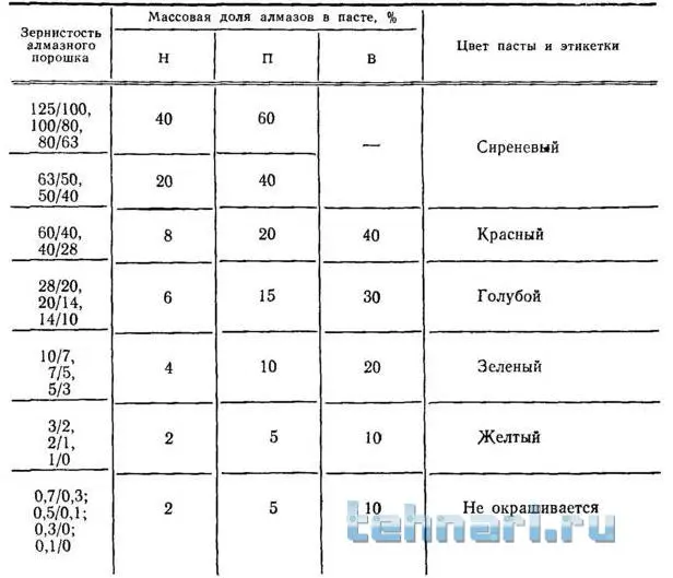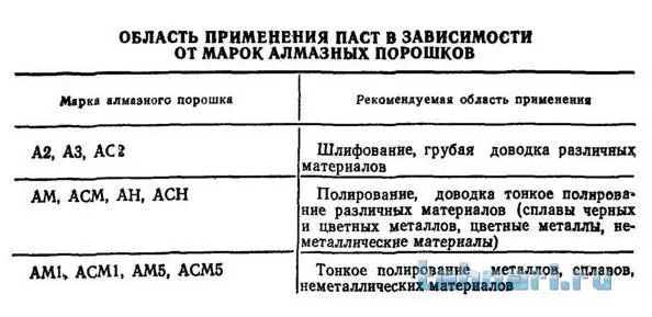 Алмазные пасты предназначены для доводки и полирования черных и цветных металлов, сплавов, неметаллических материалов, выпускаются нормальной (Н), повышенной (П), и высокой концентрации (В) в зависимости от массовой доли алмазного порошка в пасте для каждой зернистости, что определяет сферу применения того или иного вида пасты.