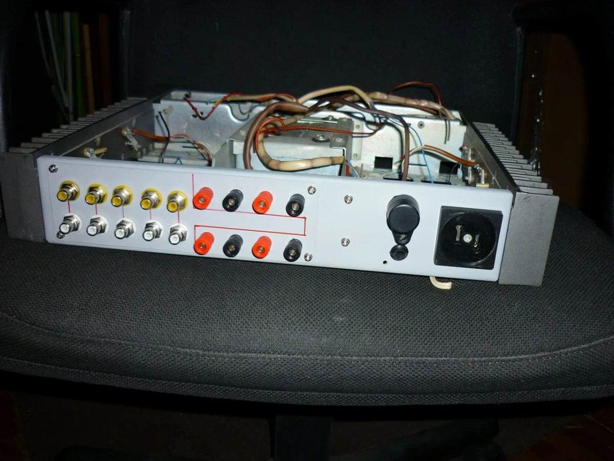 Я снова здесь, я в бархатных штанах...Продолжаю отчёт. Итак я закончил с задней панелью, а вернее с её разъёмами и покраской. Как и заказывали : четыре входа, один линейный выход RCA. Винтовые разъёмы под бананы, на две пары АС.