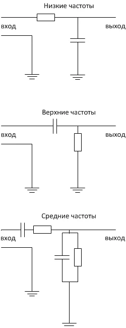Есть 3х схемы RC фильтров. Фильтр верхних частот и фильтр низких частот работают прекрасно. Но вот фильтр средних частот отказывается работать. Подскажите пожалуйста в чём может быть проблема?