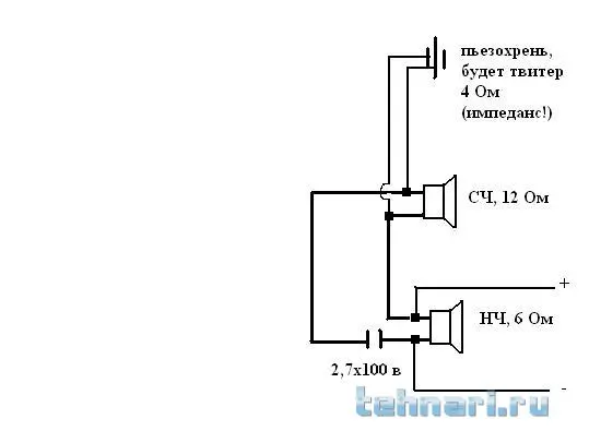 Хоть вы мне посоветуйте-как заменить пьезики на твитеры? Вводная: НЧ-6 Ом, СЧ-12 Ом и пьезик (это родной вариант)=импеданс колонки 6 Ом. Я выкинул пьезики и купил твитеры по 4 Ом. Как их подключить? Схема родного(заводского) варианта прилагается.