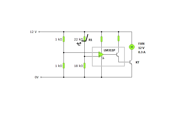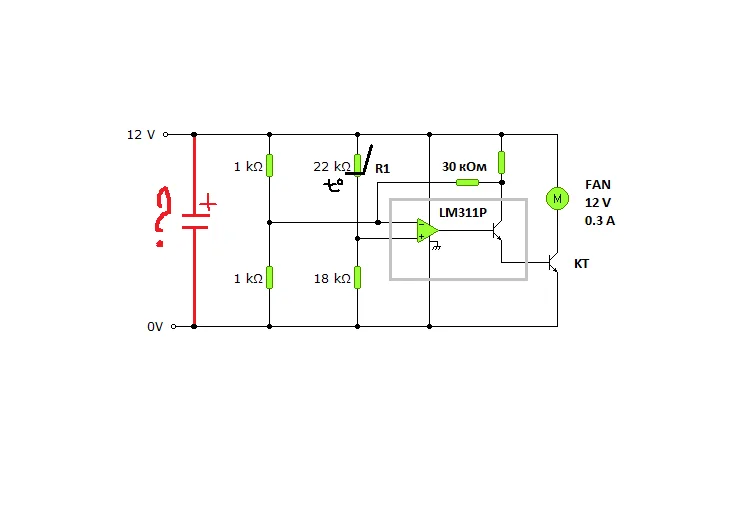 Суть работы схемы: когда на терморезисторе R1 сопротивление снизится до 18кОм и ниже, компаратор LM311P откроет транзистор КT и на кулере Fan появится напряжение 12 вольт (разумеется минус падение на КТ). Когда сопротивление на R1 станет больше 18 кОм, компаратор снимет напряжение с базы КТ и Fan обесточится. Как-то так. Подскажите пожалуйста, как мне доработать данную схему?