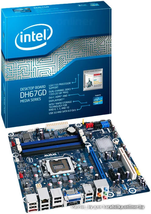 Мат. Плата Intel DH67GD (Intel H67, 4xDDR3 DIMM, 1xPCI-E 16x, 2xPCI-E 1x, 1xPCI, 3xSATA 3Gb/s, 2xSATA 6Gb/s, RAID: 0, 1, 5, 10, звук 9.1CH HDA, 14xUSB 2.0, 2xUSB 3.0, 2xFireWire (IEEE1394a), выход S/PDIF, DVI, DisplayPort, HDMI, 1xeSATA, Ethernet: 1000 Мбит/с, mATX)