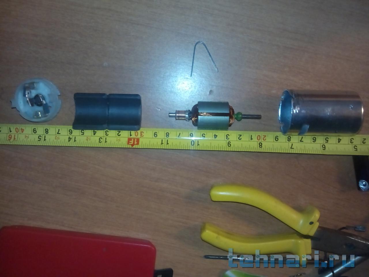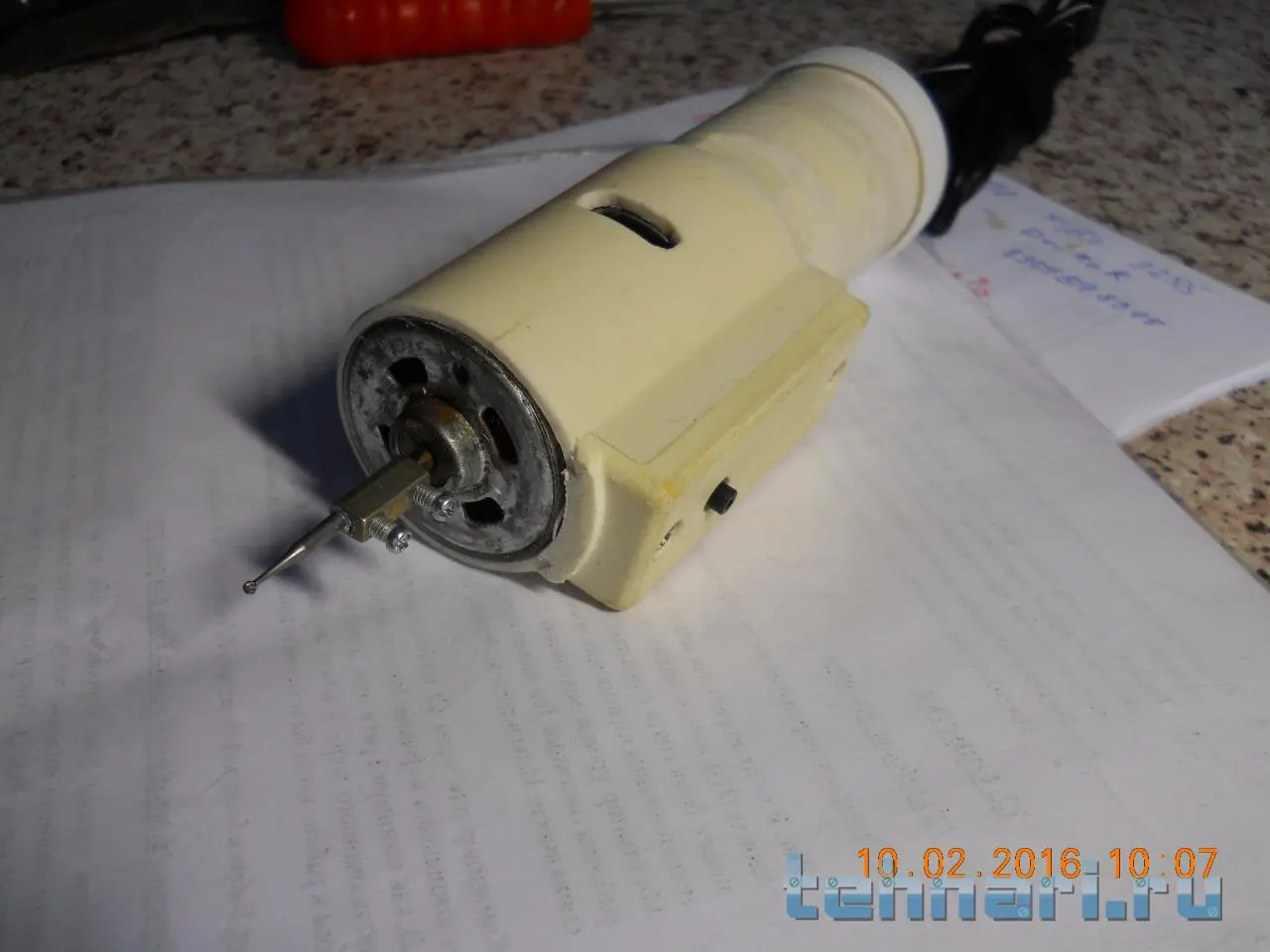 Правда из верхнего правого(он от шуруповёрта - 14,6 вольт) я уже смастырил себе бормашинку. Жду только из Китая цанговый патрон.Корпус - наконечник от шланга пылесоса,который присоединяется к пылесосу,а задняя заглушка -пробка от молочной бутылки.В общем собрано на "коленке"