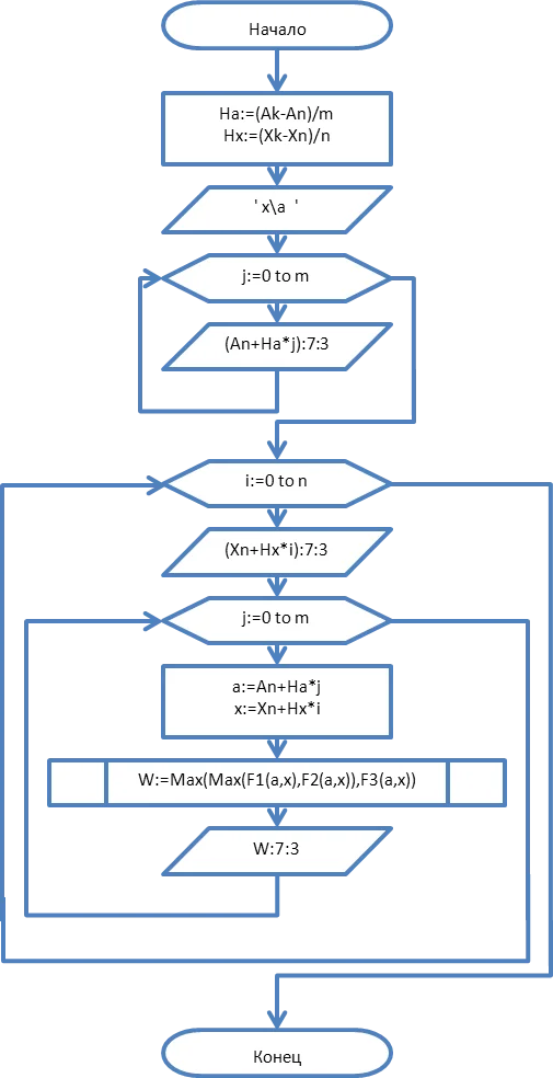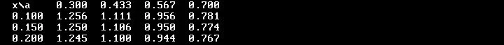 Теперь, собственно, смысл задания. Составляем таблицу, причем договоримся, что строки соответствуют значениям х, а столбцы - значениям а. На пересечениях поместим максимальные значения из трех функций, вычисленных при данных х и а. В конце поставим readln, чтобы приостановить выполнение программы и посмотреть на результат.