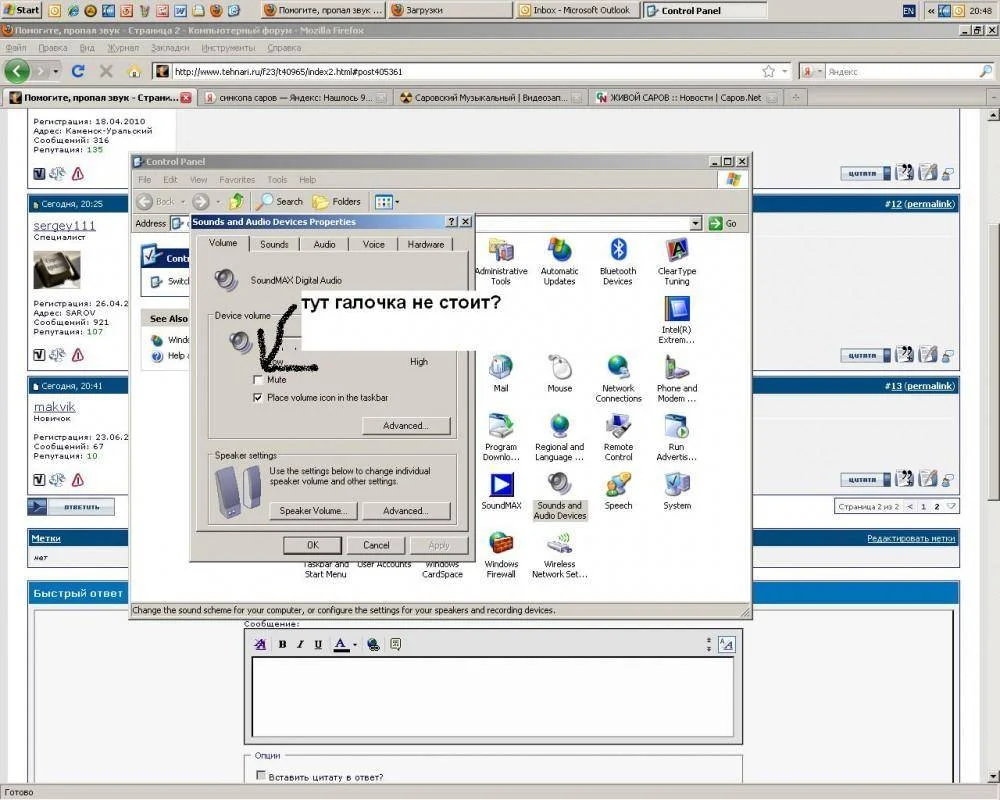 Нужно после переустановки операционной системы ставить драйвера на звук,в данном случае Realtek.Какая материнская плата у вас?makvik написал(а):Перустановил винду-не помогло