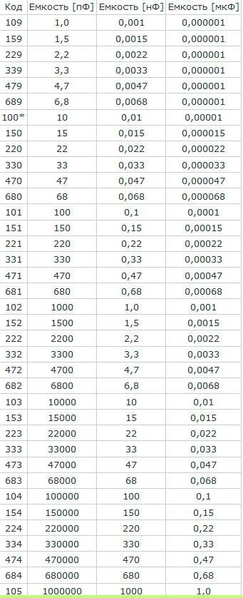 Подскажите расшифровку маркировки керамических кондёров ,тоесть на сколько мкФ,пФ.нФ и до скольких вольт