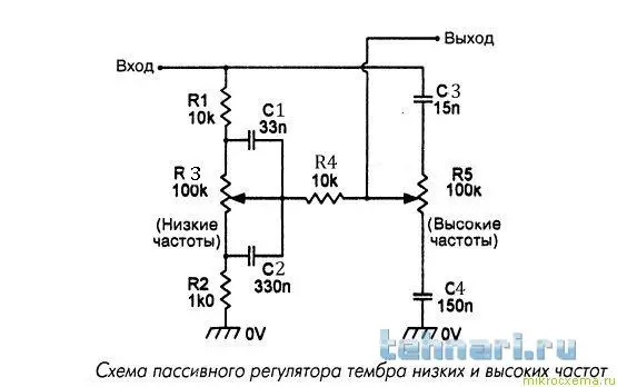 Между темброблоком и УНЧ должен стоять регулятор громкости и разветвитель на два канала что-то типа такого: