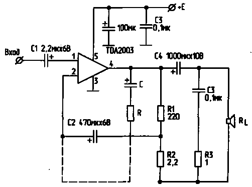 Какие в этой схеме (см. ниже) нужны конденсаторы, резисторы и колонка? И что означает в низу схемы пунктиром?