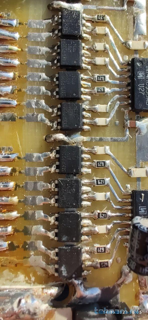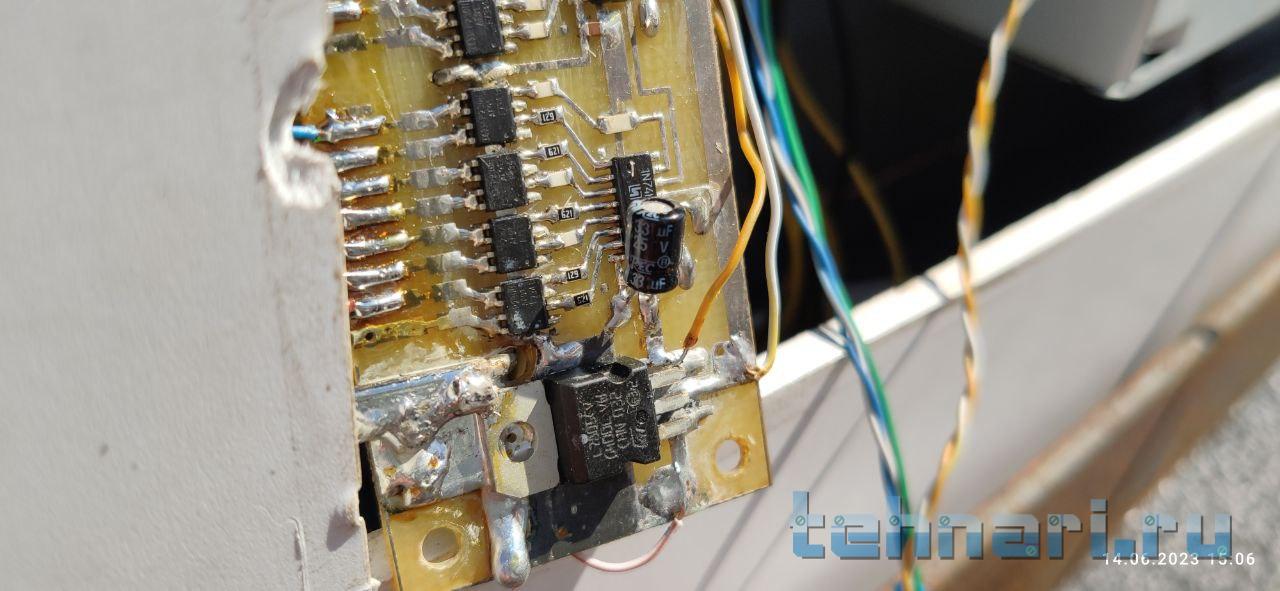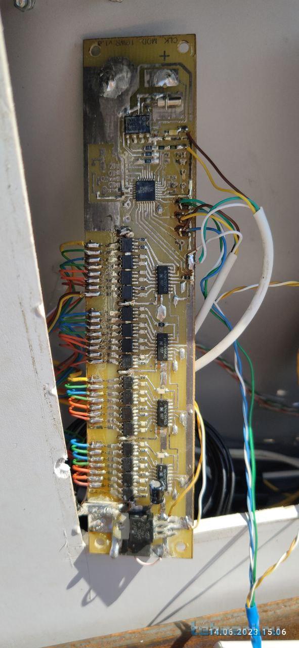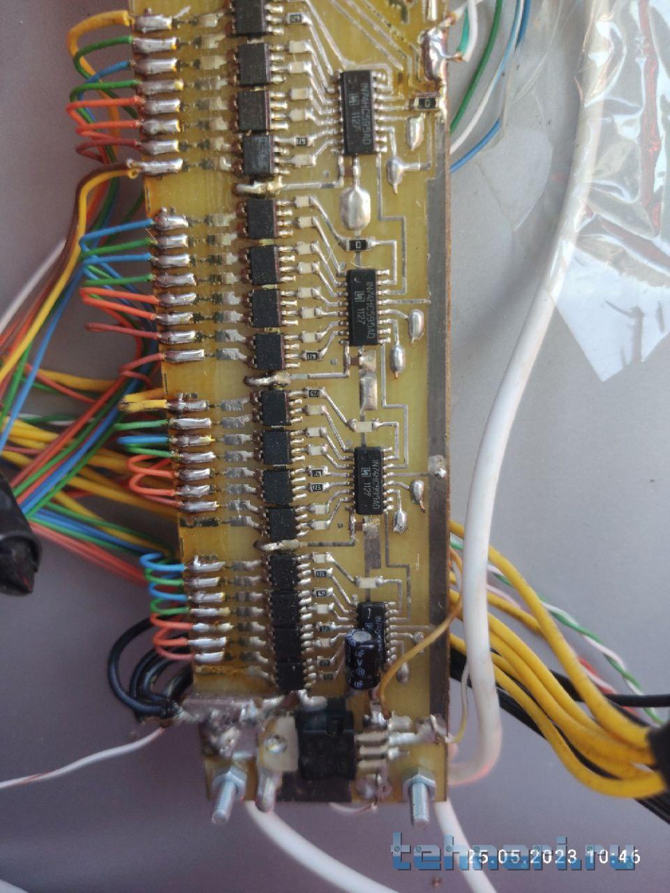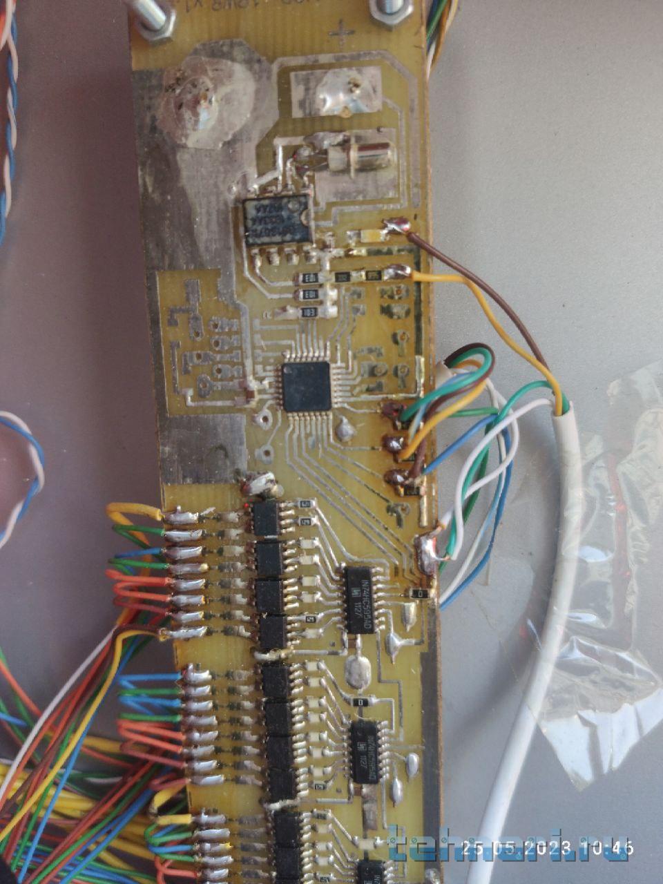 Добрый день! Помогите разобраться в принципе работы электронных часов с термометром. Десло в том, что эти часы были собраны местным кулибиным лет 10 назад, благополучно лежали на складе и вот решили их повесить на фасад здания, они поработали месяц и сгорел блок питания (обычный от ПК) после чего блок был заменен и часы стали гореть очень тускло. Фото платы прилагается.