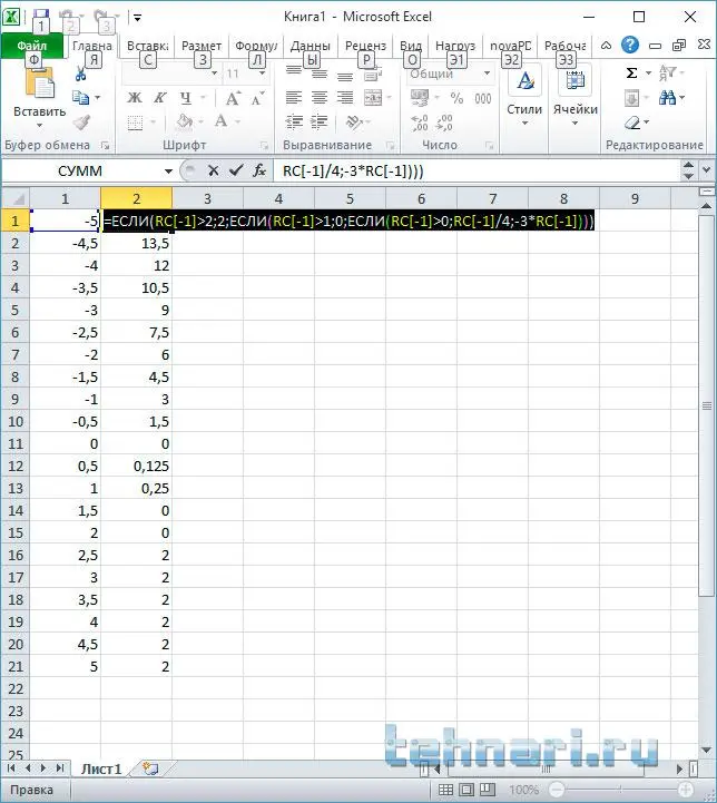 =ЕСЛИ(RC[-1]>2;2;ЕСЛИ(RC[-1]>1;0;ЕСЛИ(RC[-1]>0;RC[-1]/4;-3*RC[-1])))