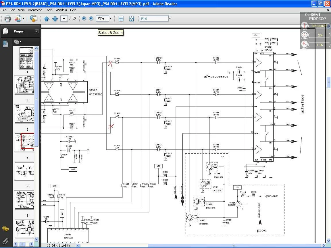 Вначале подумал, что подключаться надо ко входу TDA7433(регулятор громкости) но потом смотрю, в схеме используются только 2 входа этой микрухи, а канала на магнитоле 4. Несмотря на это, из неё идут провода на все 4 канала! Я так думаю надо впаяться в места, отмеченные крестиком через резистор 1 кОм. Это входы фронтальных динамиков LF(Left Front) и RF(Rigth Front). Возможность изменения громкости с помощью кнопок на магнитоле не гарантирую, возможно придётся изменять уровень входного сигнала.