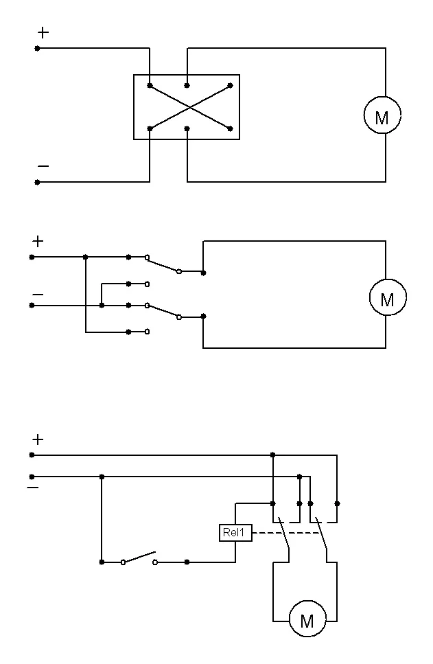Есть какая-то схема переключения полярности питания(ну что б если замкнуть 2 провода то поменялся поворот моторчика)(еще можно если смена направленности моторчика производилась автоматически)