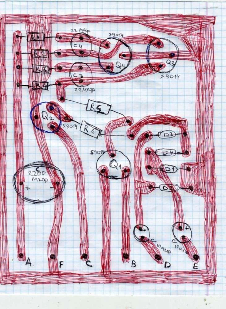 Приветствую всех.Натолкнулся на этот сайт и решил задать вопрос насчёт платки от китайского мафона с цветомузыкой.Маг работает ,а вот платка была с него выдрана и я хочу её наладить .Вроде просто всё ,но нашёл только подачу питания на неё ,а вот дальше никак.там есть ещё 4точки подключения этой цветомузыки(обыкновенные диоды цветные мигающие скорее всего -ТИПА ЦВЕТОМУЗЫКА).Конечно народ счас скажет -НАФИГА ТЕБЕ ЭТО "ДОБРО" ВОССТАНАВЛИВАТЬ,ВЫКИНЬ И Т Д,но мне очень бы хотелось наладить эту самую так называемую цветомузыку.платку попытался сфоткать на камеру -но картинка вышла паршивенькая (не разглядеть всех деталек),вот и пришлось нарисовать .Может кто знает эту схему и даст ссылку или просто объяснит куда там эти диоды втыкались (там вроде цепочки диодов),Я чего то думал что там есть вход и выход -но пока никак не получилось .Попытаюсь вставить рисунок ,если не получитс я то дам ссылку на радикал фото.