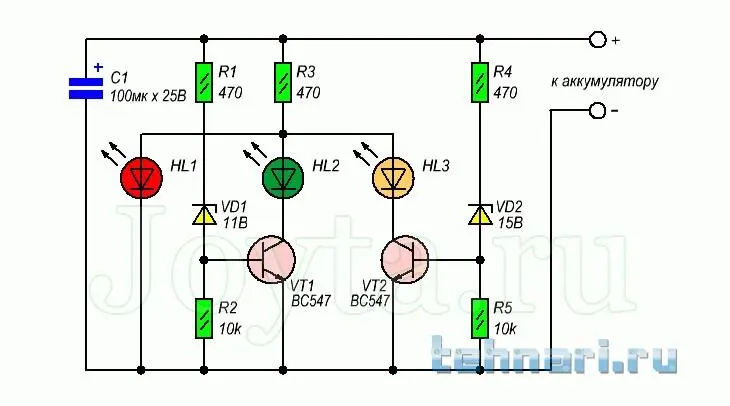 Если внимательно посмотреть на схему, то видно, что красный светодиод с падением напряжения 1,8-2в подключен параллельно цепи зелёного светодиода с падением напряжения 3- 3,5в и транзистора. Схема не будет работать потому, что красный светодиод будет шунтировать всю остальную схему. Эту схему рисовал дилетант типа Кашкарова.