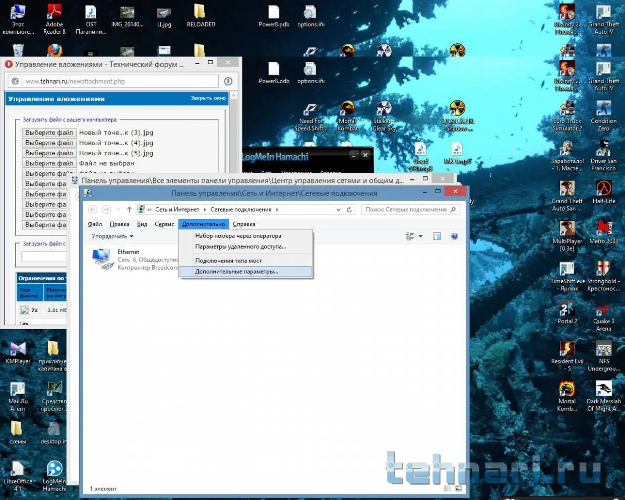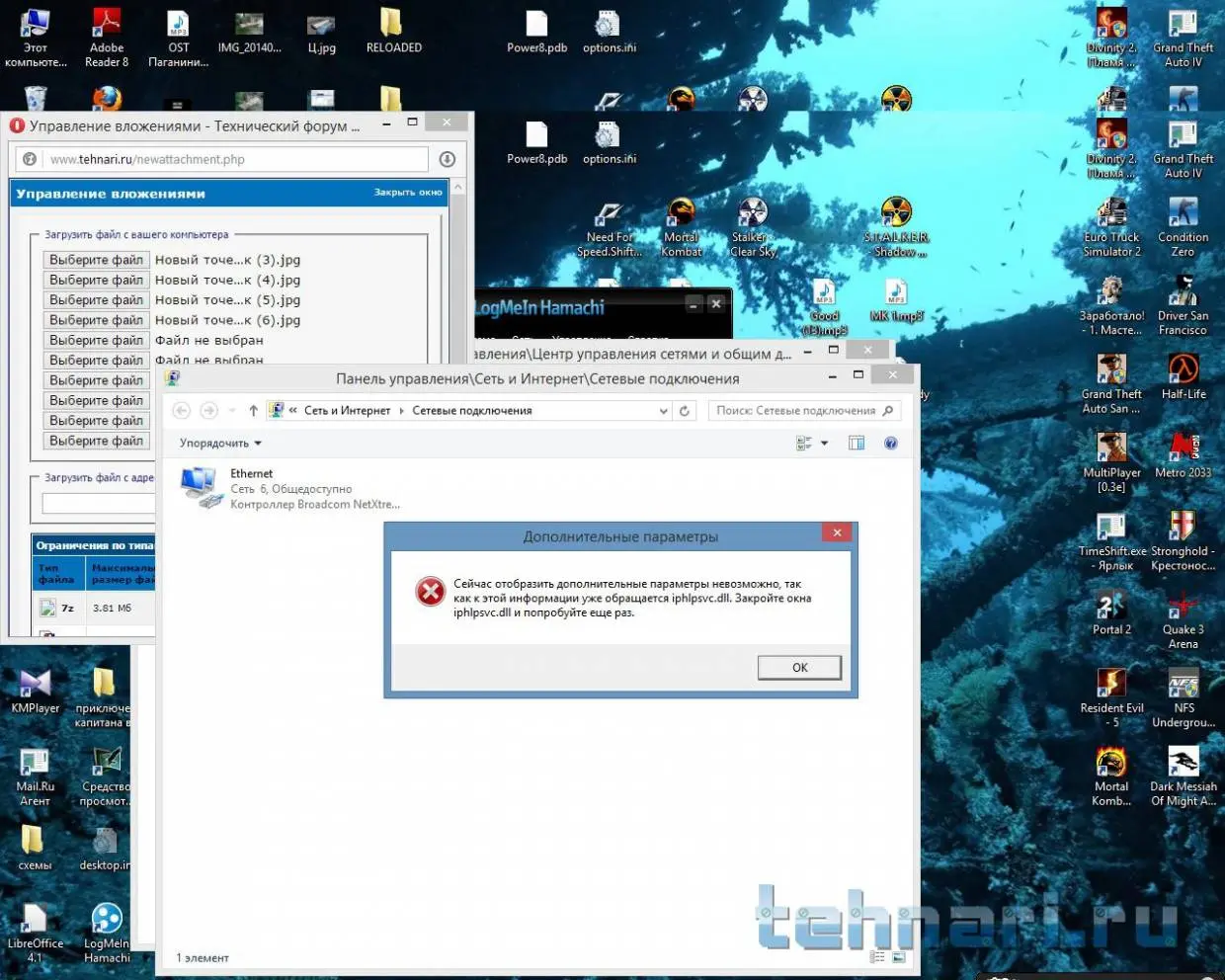 Пытался зайти в дополнительные параметры сети, но он не пускает, пишет что iphlpsvc.dll уже занимает этот процесс, как то так.. у меня windows 8.1