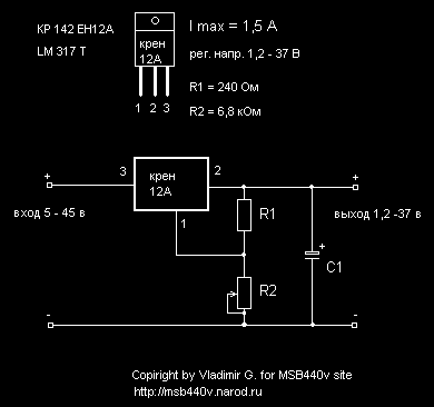 Конденсатор С1 в зависимости от потребностей в сглаживании пульсаций от 50 до 500 мкФ 50в. Его можно даже и исключить, если на входе после выпрямителя уже стоит конденсатор с "увесистой" емкостью хотя бы ≈ 1000...2000 мкФ.