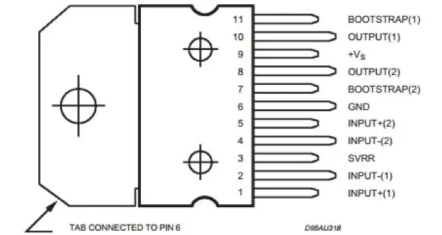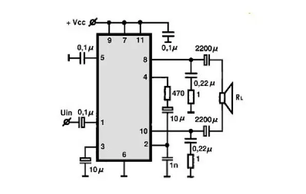 Так по схемке смотрим - вход нога 1 , выход на динамики через конденсаторы с ноги 8 и 10. Цоколевку самой микросхемы смотри - фото ведь тоже дал.