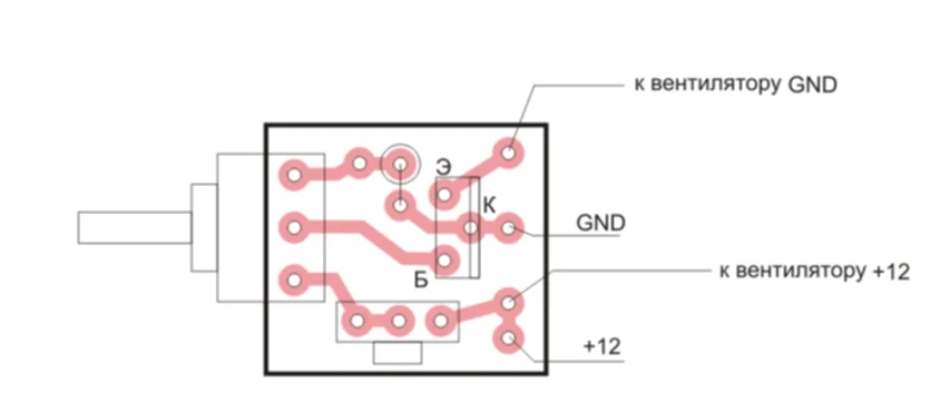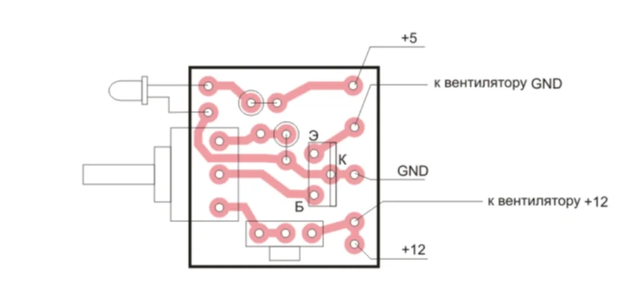 последовательно со светодиодом 1.2-1.6 кОм, на вентилятор и на GND ...