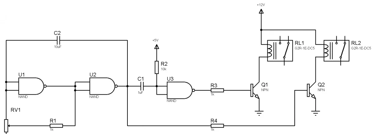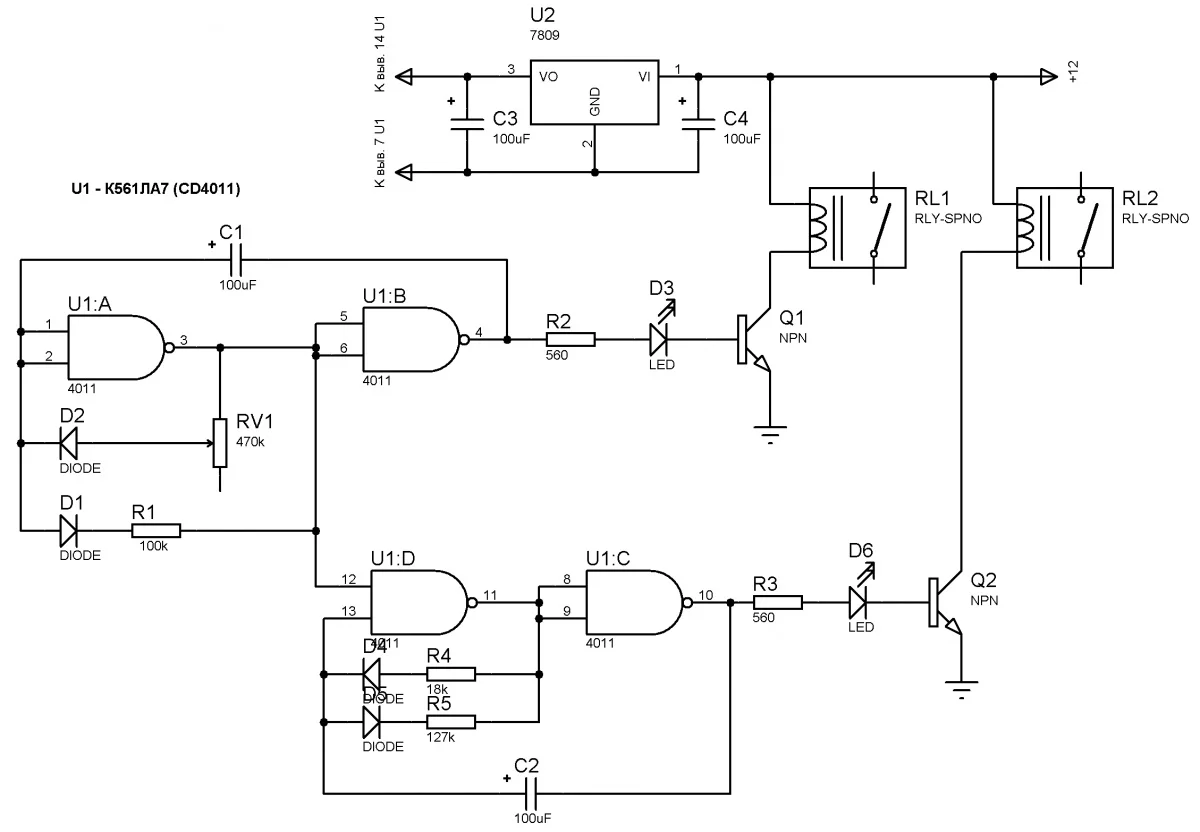 RV1 - это переменный резистор. Наминалы элементов схеме установлен на угад, так что их прейдется подбирать самому. И параллельно реле нужны диоды, для гашения ЭДС.