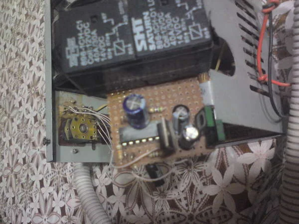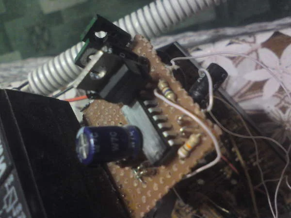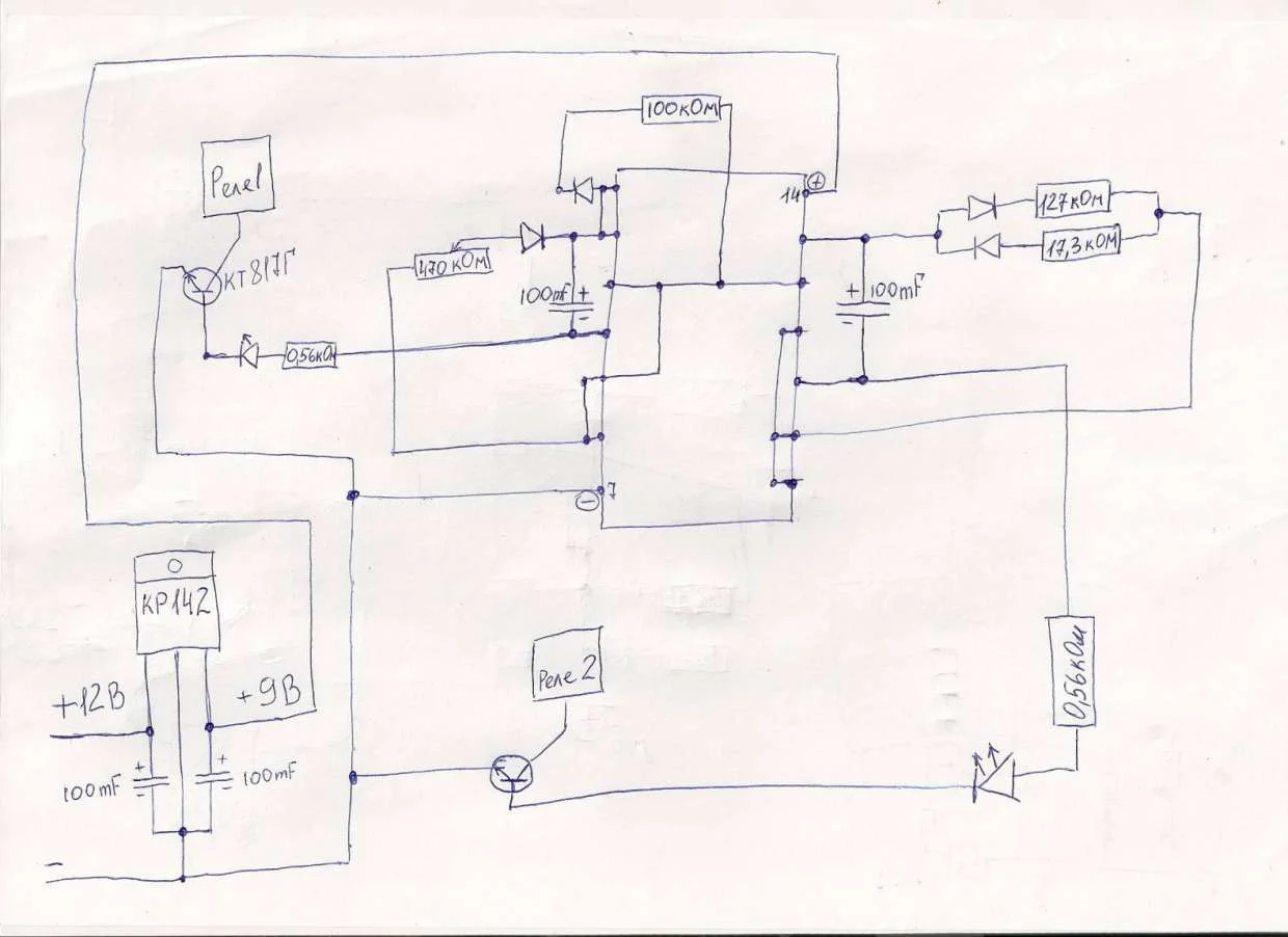 Добрый вечер всем. Ребята помогите разобраться. Есть у меня самоделка для управления двумя нагрузками и что-то полетело. В мастерской делать без схемы никто не хочет браться, а тот кто делал очень далеко живет. Вся схема построена, как я думаю, на микросхеме, название которой мой конструктор стер наждачной бумагой, да бы не копировали.Названия от него добиться не могу, а ехать ,чтоб он отремонтировал очень далеко. Принцип работы устройства такой-при включении питания включается первая нагрузка, при отключении первой - включается вторая. Далее весь цикл повторяется до бесконечности. Время работы второй нагрузки 2-3 секунды, время работы первой регулируется ручкой резистора и колеблется от 1 секунды до 1 минуты (это не принципиально, длина регулируется номиналом резистора), отключается первая нагрузка секунд на 7-8 и в этот промежуток включается вторая на 2-3 сек (как было написано выше),потом все заново.Нагрузкой вся эта схема управляет через NPN транзисторы кт817г, далее через авто реле.Питание микросхемы 12 В, нагрузка также 12 В Управление на транзистор подается через светодиод, соответственно первый или второй. Если кто-то разберется,помогите с маркировкой этой схемы или подскажите можно ли сделать такую систему на таймере NE556N, такой у меня есть Конденсаторы два штуки по 100 mF, как я понял на каждый канал по одному.На фото я один выпаял,такой же синенький стоял, только на другой стороне схемы . Надеюсь сообразите