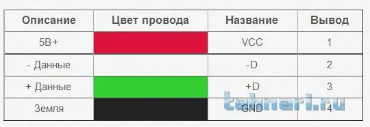 Чёрный -, красный+. Оставшиеся 2 методом тыка. Проверить цвета проводов питания нетрудно. В ЮСБ штекере они с краёв. Есть картинки распайки, чтобы уточнить.