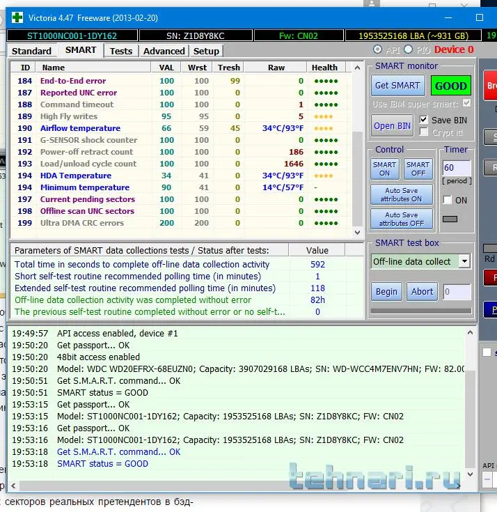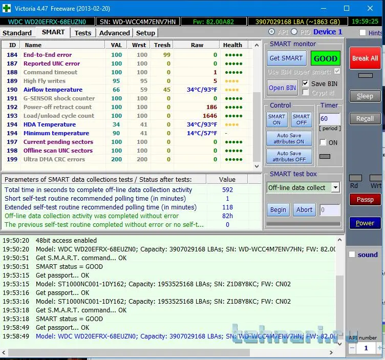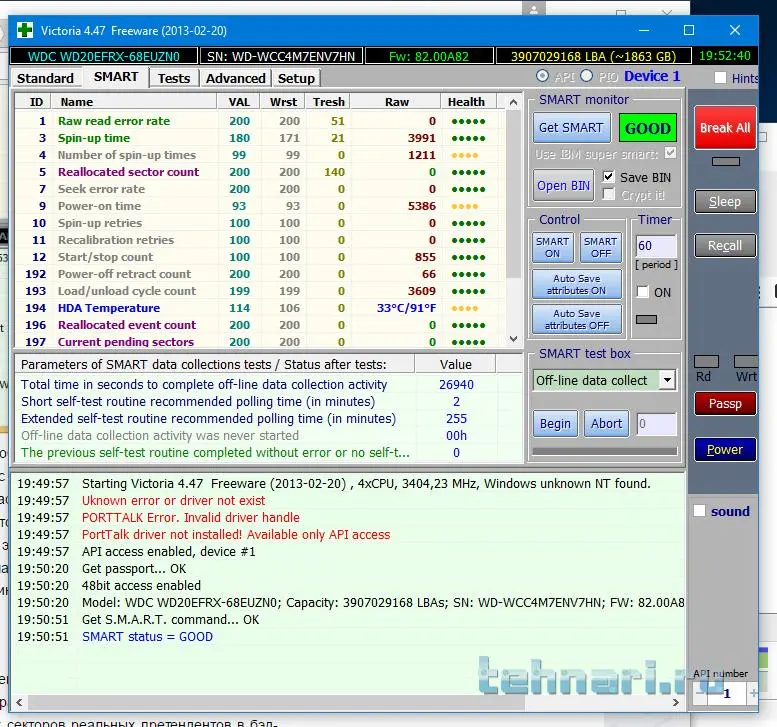 Смарт сделал Викторией, фотографии должны быть с этим сообщением (системный сейчас WD20EFRX, до переустановки винды был другой)