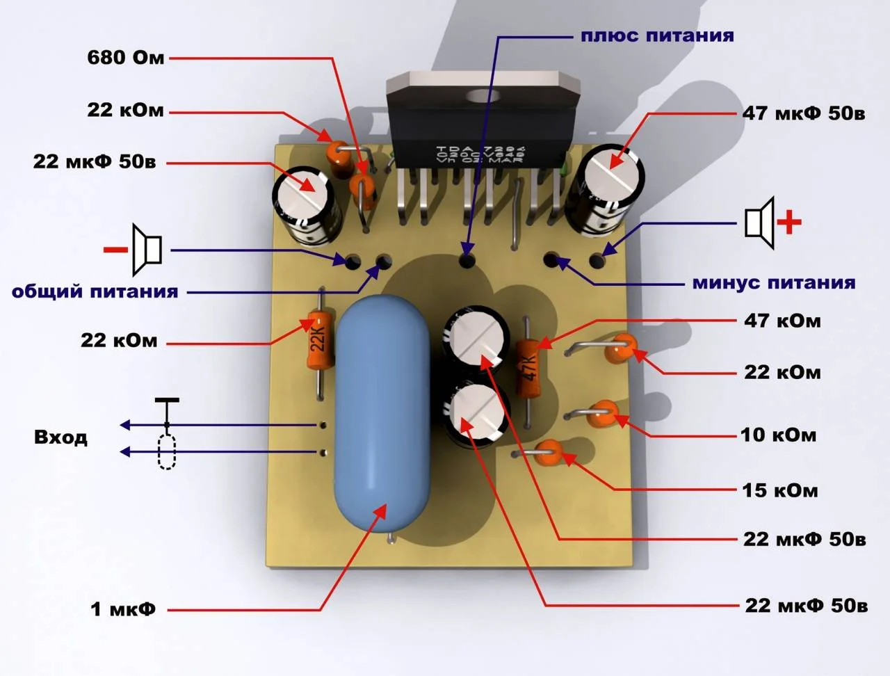 Всем привет. Решил собрать усилитель на TDA1558Q. Поехал со списком в радио магазин ничего не нашел там. И вспомнил про микруху эту 1558 даже не зная как ее собирать все же решил купить их аж 2 шт. Пришел домой нашел в 3д ее. Решил собрать ее навесным монтажом. Собрал ее (индентично как на рисунке), запитал ее от блока питания компьютерного источник сигнала был компьютер или сотовый. Все бы хорошо даже звук громкий, но есть шум шипение довольно таки сильное. Что может быть?