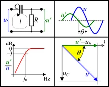 Простейший электронный фильтр верхних частот состоит из последовательно соединённых конденсатора и резистора. Конденсатор пропускает лишь переменный ток, а выходное напряжение снимается с резистора. Произведение сопротивления на ёмкость (R×C) является постоянной времени для такого фильтра, которая обратно пропорциональна частоте среза в герцах.