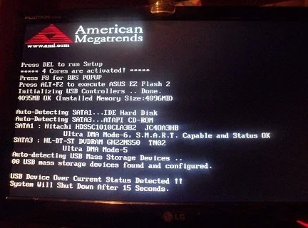 При включении ПК начинается загрузка, но сразу после окна с системными данными появляется заставка с логотипом American megatrends с сообщением на английском о том, что система через 15 секунд будет выключена, что и происходит. Как решить проблему?