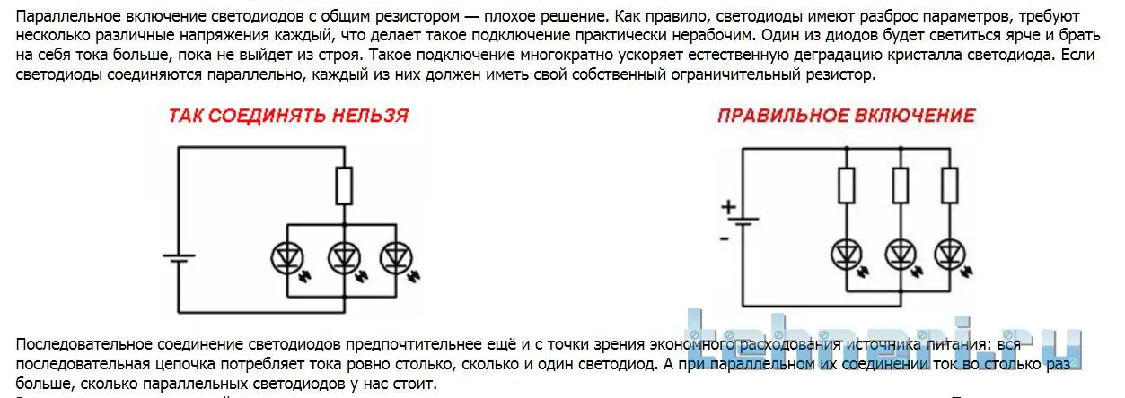 Так что надо стремиться нужно к картинке №2 у ВНЗ, если питание больше 3 В. Так же и выполнено на светодиодной ленте на 12 V на каждые 3 диода 1 балластный резистор.