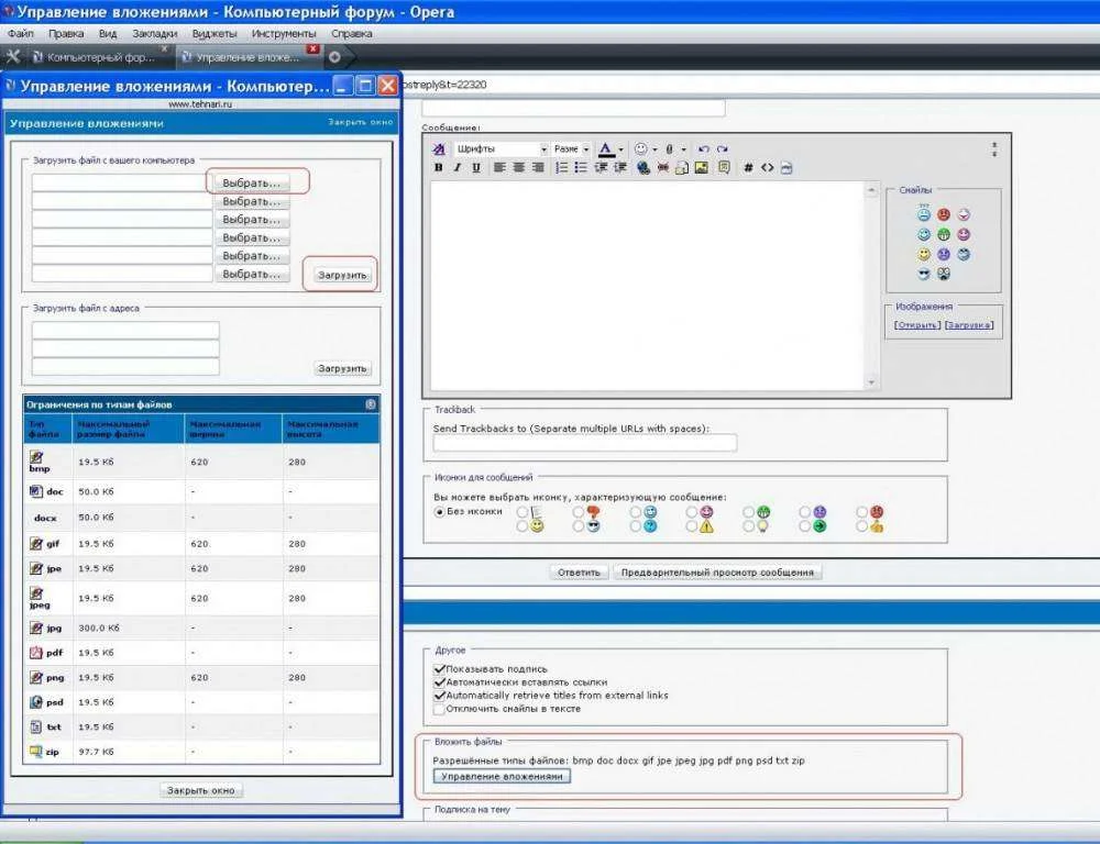 9. В появившемся расширенном меню последовательно выбираем "Управление вложениями" -> "Выбрать" -> "Загрузить" (скриншот № 6). По окончании загрузки закрываем поле кнопкой "Закрыть окно";