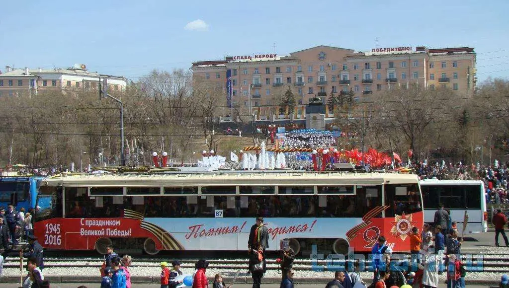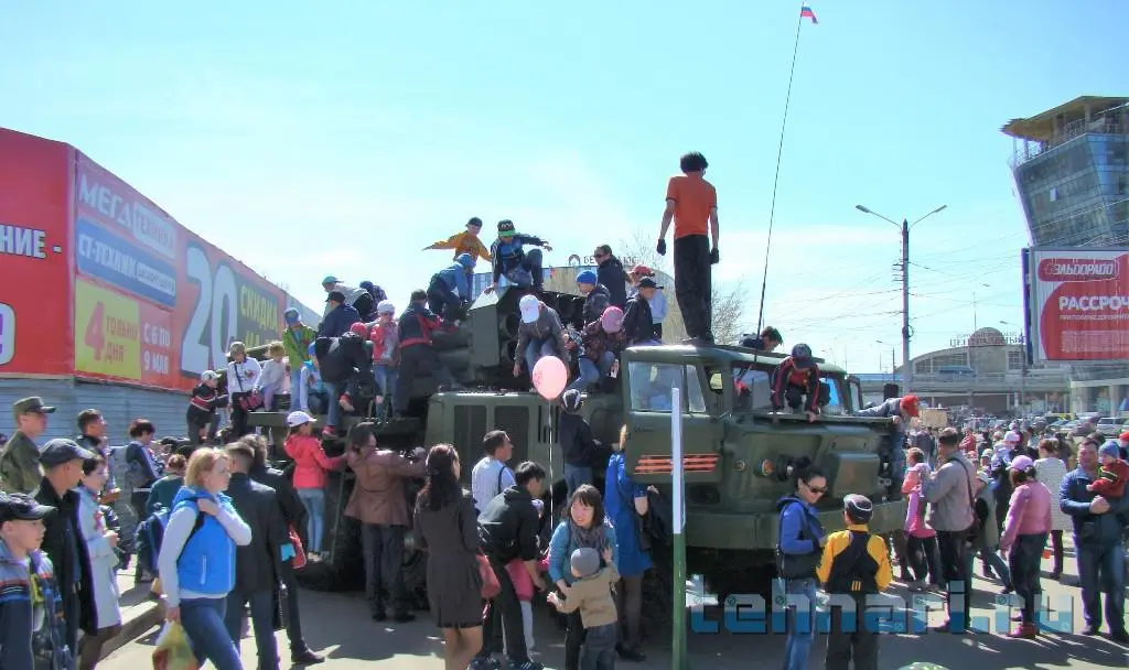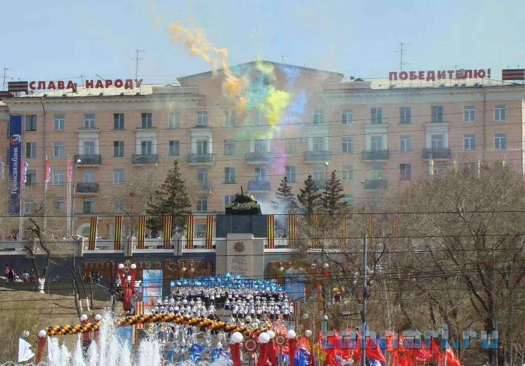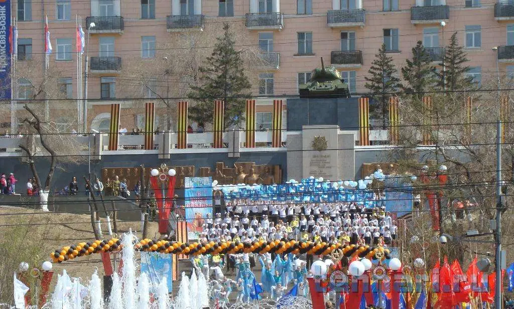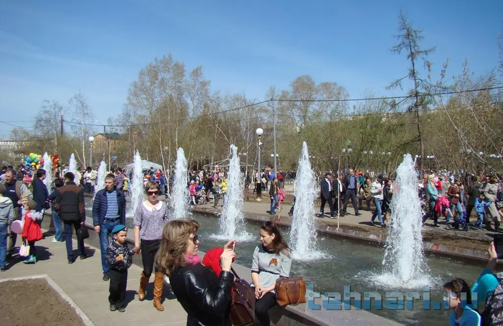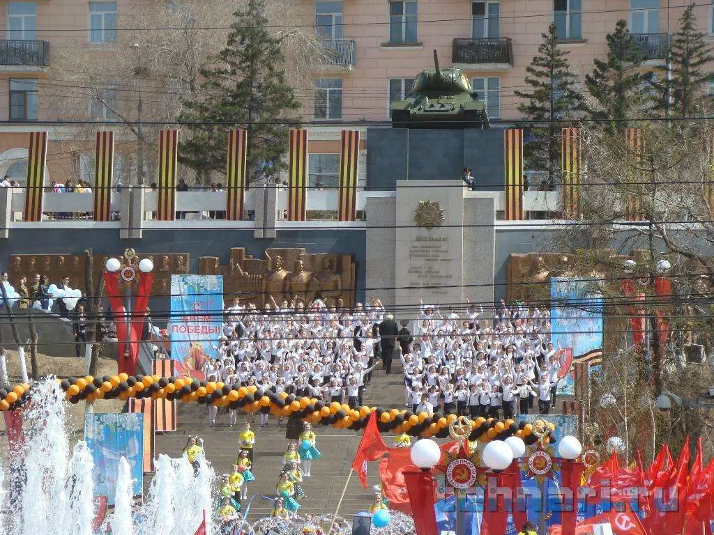 После парада воинского гарнизона г.Улан-Удэ на центральной площади, завершившегося прохождением военной техники народ потянулся к Мемориалу победы, где праздник продолжился. К празднику обновился сквер, взметнул свои струи вверх новый фонтан.