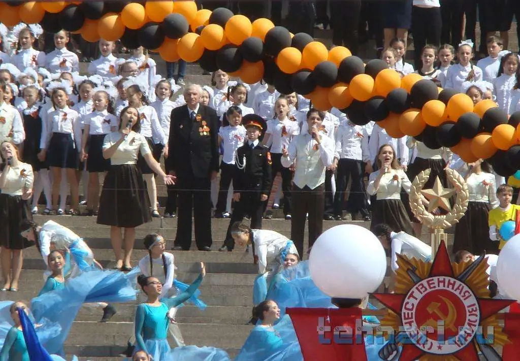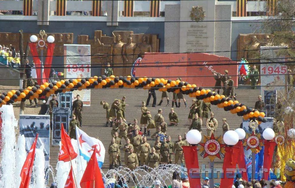 А тем временем с площади Советов к Мемориалу подходит бесконечная колонна "Бессмертного полка", автобусы привозят ветеранов ВОВ и на ступенях Мемориала развертывается праздничное театрализованное представление.