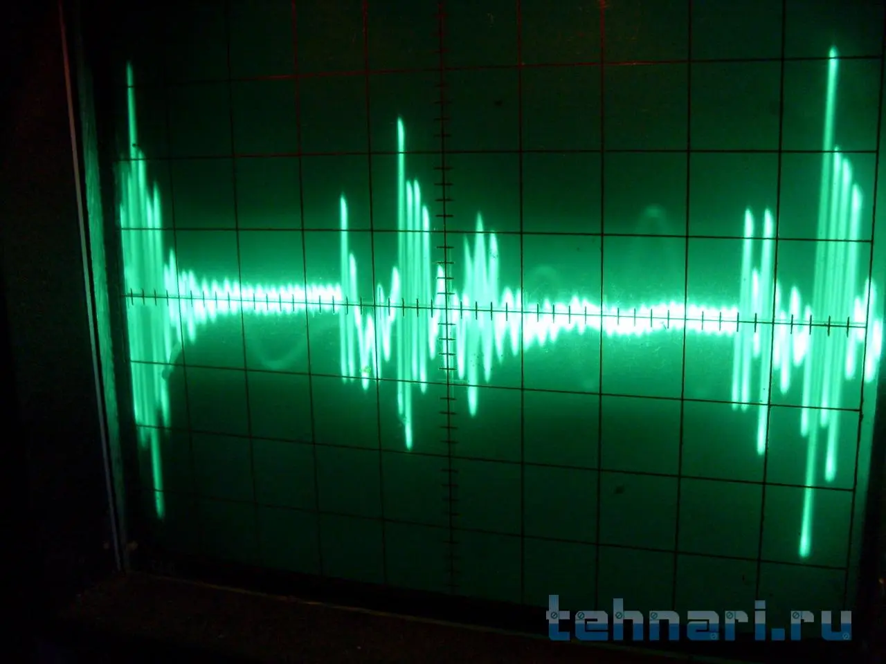 да,так оно и есть. вот фото осцилограммы на выходе моего преобразователя. амплитуда помех около полувольта(0.2 вольта клетка). частота следования пачек помех около 200кГц. ну а в самой пачке частота около 10Мгц.для сравнения померял выходное напряжение блока питания компа с которого запитываю мой преобразователь - так там прямая линия вообще без каких-либо помех.даже не стал фоткать.