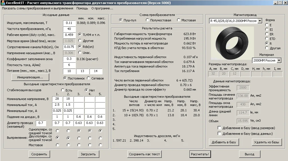 Сделал в другой программе два расчета на 6 и 7 витков в первичке. Если 7 витков влезут в намотку одним слоем без нахлеста, то лучше намотать 7. Если не влезут в один слой, то мотай 6.