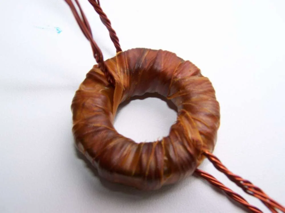 После того как с первичной обмоткой законченно, наматываем еще один слой трансформаторной ткани или изолены. Приступаем к намотке вторичной обмотки она содержит 2х18 витков. В оригинальной статье автора вторичная обмотка намотана проводом 1,5мм в одну жилу, у меня такого провода не оказалось, использовал провод 1,2мм и вторичную обмотку намотал в две жилы. Мотаем аналогично первичной обмотке, только первые 18 витков в 2 жилы уже распределяем по всей окружности ферритового кольца, опять обматываем слоем тряпичной изоленты, затем вторую часть вторичной обмотки.