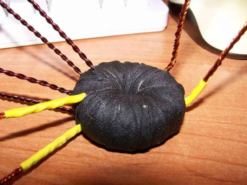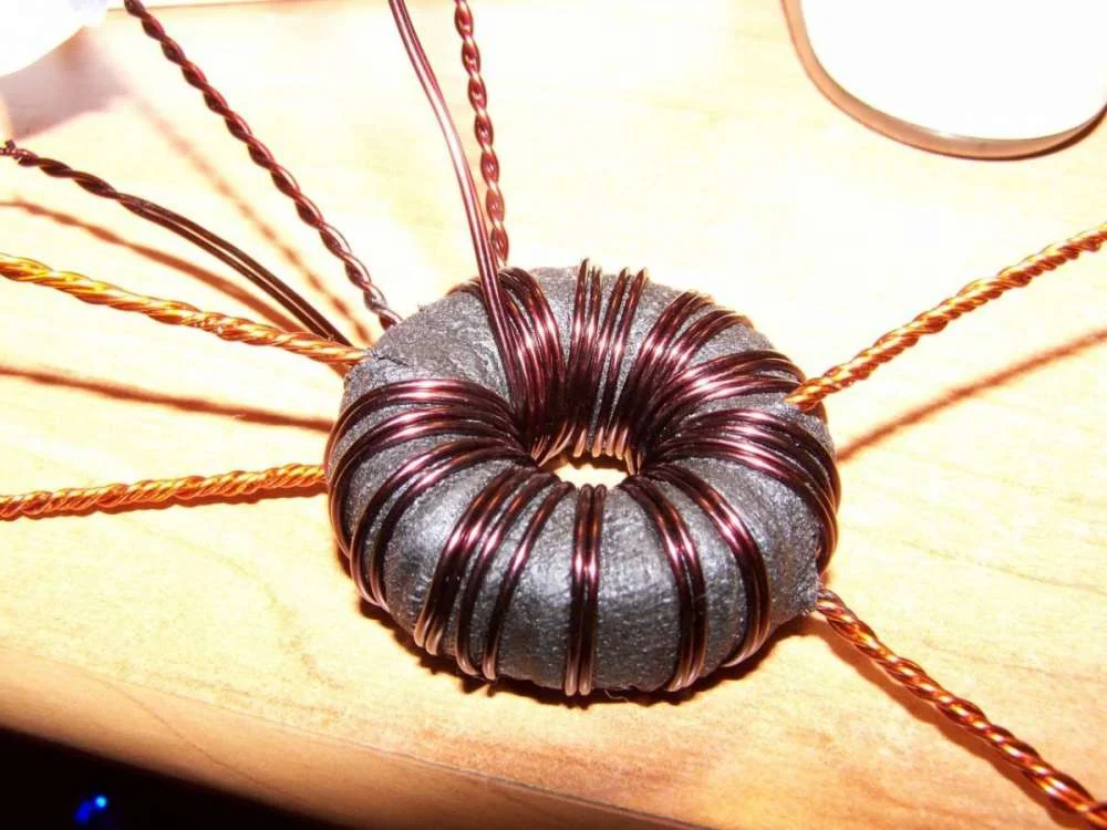 Теперь начинаем мотать первичную обмотку 2х6 витков, я использовал провод 0,7мм в пять жил, на одной половине кольца наматывается 6 витков одинарным проводом, распределив их равномерно далее берем вторую жилу и наматываем в плотную к первой и так все пять жил. Дальше от конца первой половины обмотки начинаем мотать обмотку на второй половине кольца, таким же методом. Получаем первичную обмотку из двух полу обмоток и имеем в итоге четыре вывода. На выходе жилы скручиваются, но перед этим каждую жилу лучше зачистить, потом легче будет лудить.