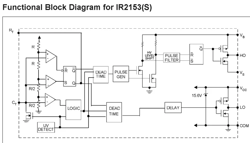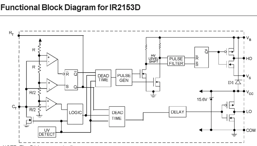 Рассматривая правые части схем мы видим, что IR2153D отличается от IR2153 наличием встроенного диода D1. Таким образом буква "D" в названии микросхемы обозначает не тип корпуса (DIP), а наличие диода внутри микросхемы и дополнительный внешний диод для IR2153D ставить не надо. Функциональное назначение этого диода - обеспечить "плавающее" питание драйвера верхнего ключа при стандартном применении микросхемы.