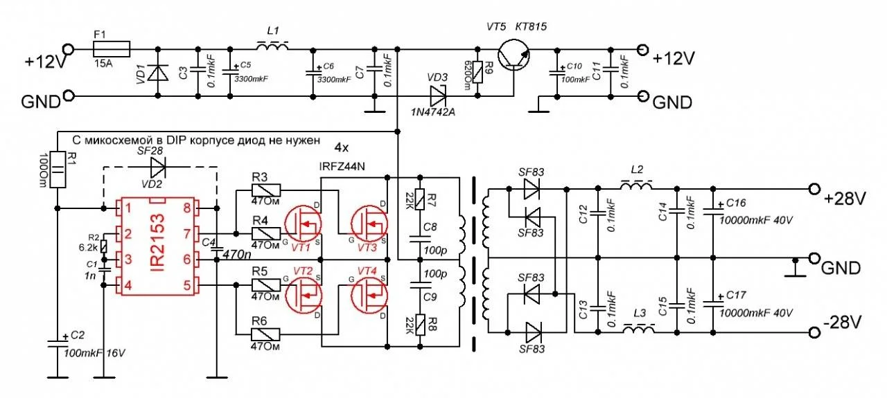 то увидим, что верхний ключ не "плавает", а жестко привязан к минусу питания. В этом случае, независимо от типа микросхемы, выводы 1 и 8 следует соединить перемычкой, так как прямое питание драйвера верхнего ключа будет лучше, чем через диод.