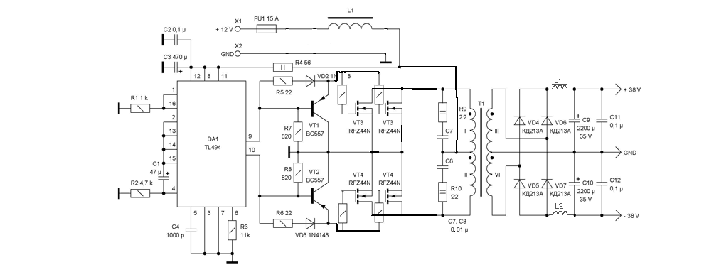 И 3я TL494 нога в этой схеме не используется,оторве ее от -12в