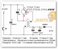 Здраствуйте,перейдем к делу: нужно примерно из 3вольт,как минимум 6вольт,ниже показана схема преобразователя,нужна помощь по трансформатору.И еще вопрос:может легче сделать из зарядника от Nokia?:tehnari_ru_325: