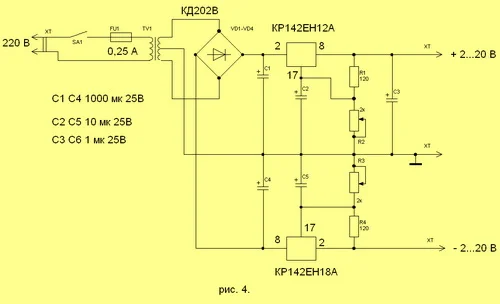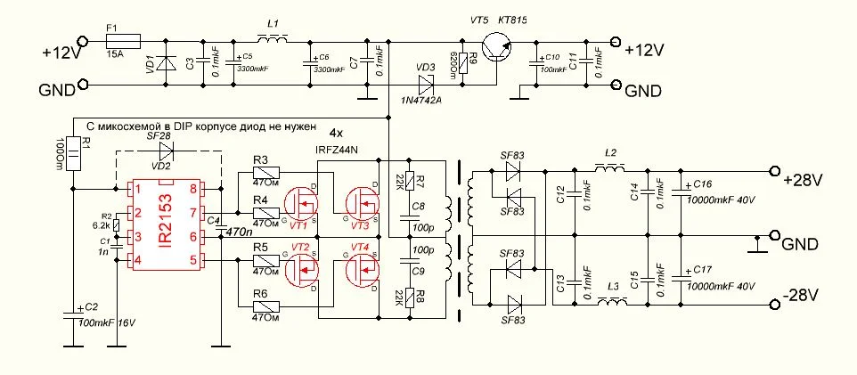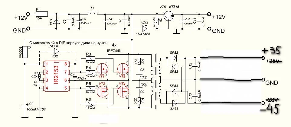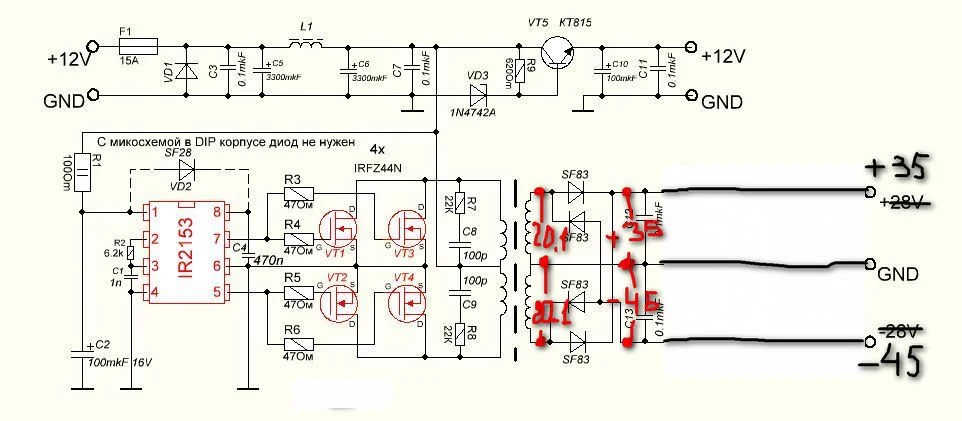 Приветствую. Собрал 2 преобразователя по схеме DDREDDa, но вылезла такая проблема: мотаю транс, впаиваю, подключаю, замеряю напряжение(переменное, перед диодами) +/-20.1 вольта оба плеча все ровно и четко. Замеряю после выпрямителя: 1 плечо +35.1, 2 плечо - 45.1. Разлет 10 вольт и не чем не убрать, замерял непосредственно после диодов напряжение такое же. Диоды стояли КД213Б, заменил на КД213Г, потом на FR607, не помогло..... Подключаю конденсаторы 10000/50в, через несколько секунд взрывается предохранитель 30-и ампер.(сперва стоял на 2.5А, не выдерживают, так и дошел до 30А) Транс становится горячим, раз через раз взрывались выпрямительные диоды. Без кондеров транс не греется, предохранитель цел, но разлет в плечах 10 вольт. Конденсаторы пробовал разные. Подскажите как решить проблему, мучаюсь почти месяц, зашел в тупик......... Это творится на обоих преобразователях.