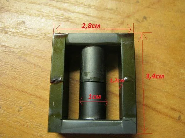 вопщем вот фото транса разобранного тут же указал размеры теперь подскажите сколько витков мотать первичку сколько вторичку и каким проводом схема будет вот эта