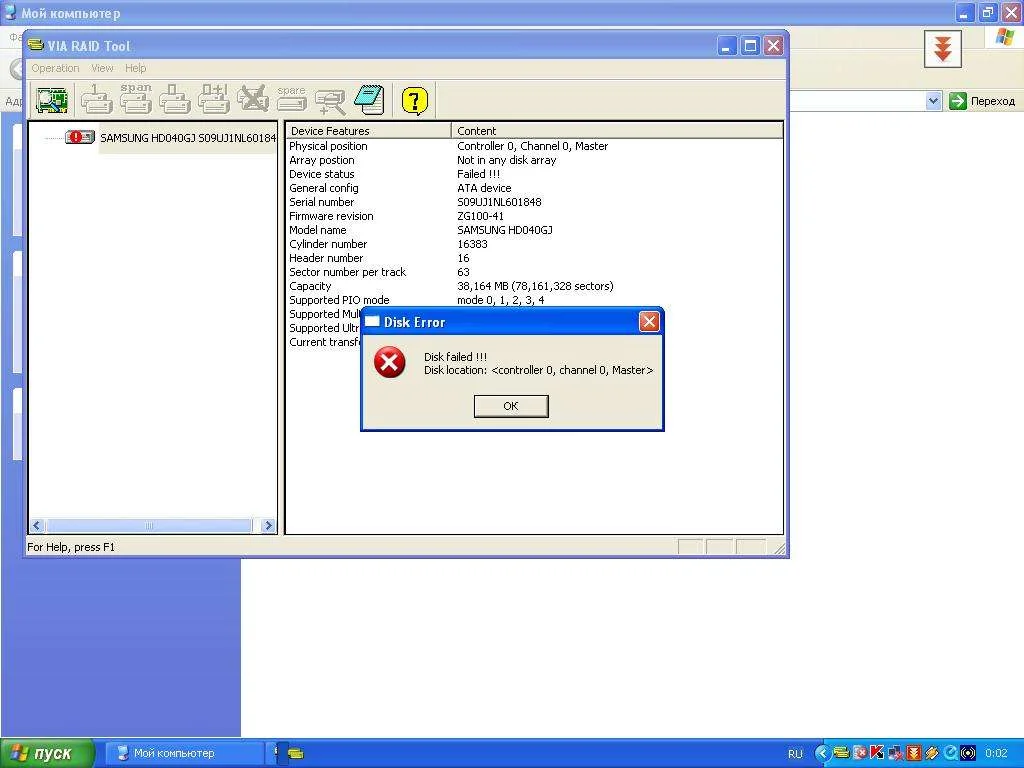 При запуске ошибка Disk error, Disk failed. HDD Samsung HD040GJ