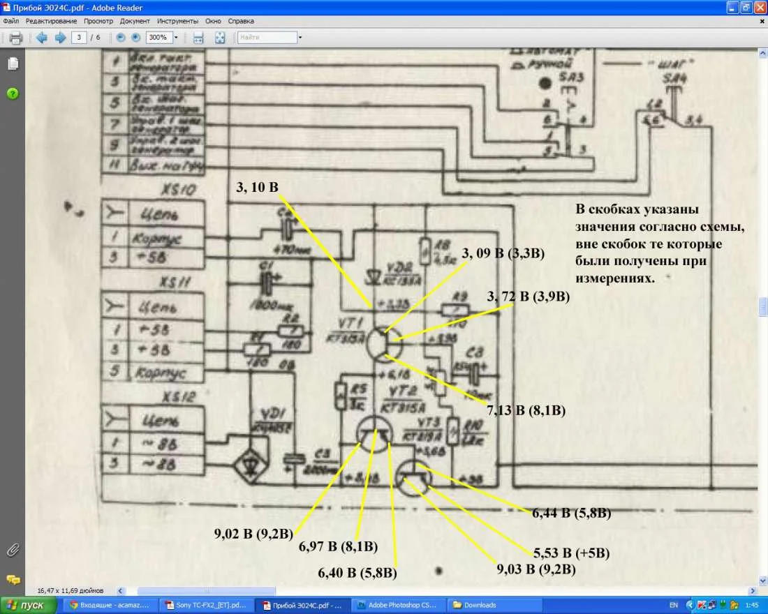 Ну не знаю что с этим транзюком (VT3) делать! Вот прилагаю схемку с измерениями моими, заметил что если отключить всю нагрузку,а это все светодиодные индикаторы, подсветка табло, которую питает эта схемка, то транзюк не греется вообще, зато напряжение на его коллекторе возрастает до 11,50 Вольт, потом постепенно подключая нагрузку он начинает разогреваться, да еще и мост греется! Но мост то я поменял, новый совершенно поставил!