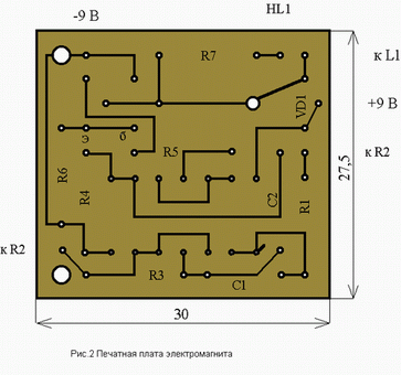 Электромагнит имеет сопротивление обмотки не менее 20 Ом. Катушка электромагнита наматывается на каркасе с внутренним диаметром 10 мм и наружным 20мм проводом ПЭВ-2 0,22. Катушку можно взять готовую от ниток, но обязательно деревянную. Намотка до заполнения каркаса. Последний слой намотки, вместе с припаянными гибкими проводами длиной около 50 см, обматывается изолентой. В отверстие катушки вставляется магнитопровод – сердечник, сделанный из мягкой стали, например, сталь 3. В качестве сердечника для катушки, взятой от ниток, хорошо ввинчивается болт М10 без головки. Прибор собирается в подходящую коробку, где устанавливается регулятор частоты, светодиод, батарея типа (Крона). Провод от магнита подключается к прибору стерео разъемом, который одновременно выполняет функцию выключателя питания. При первом включении контролируют изменение частоты включения светодиода при вращении регулятора частоты. Работу магнита можно проверить, если поднести его к экрану цветного телевизора – это безопасно. На экране синхронно со вспышками светодиода должны появляться затенения.