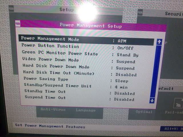 По идее в пункте Power Management Mode должны быть варианты APM, ACPI и Disabled, как говорится в инструкции к плате, но там только APM и Disabled.