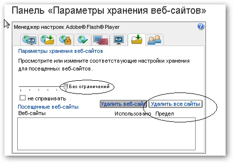 тут Adobe — Flash Player: диспетчер параметров — панель Параметры хранения веб-сайтов